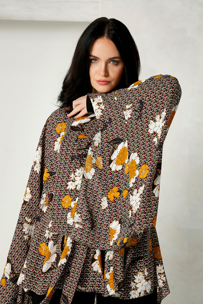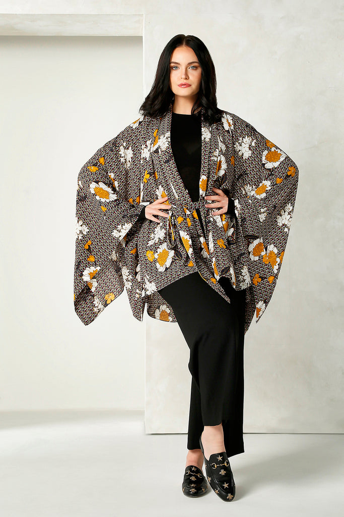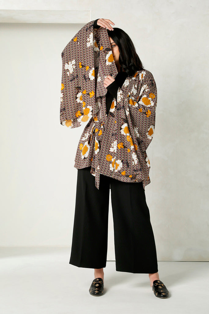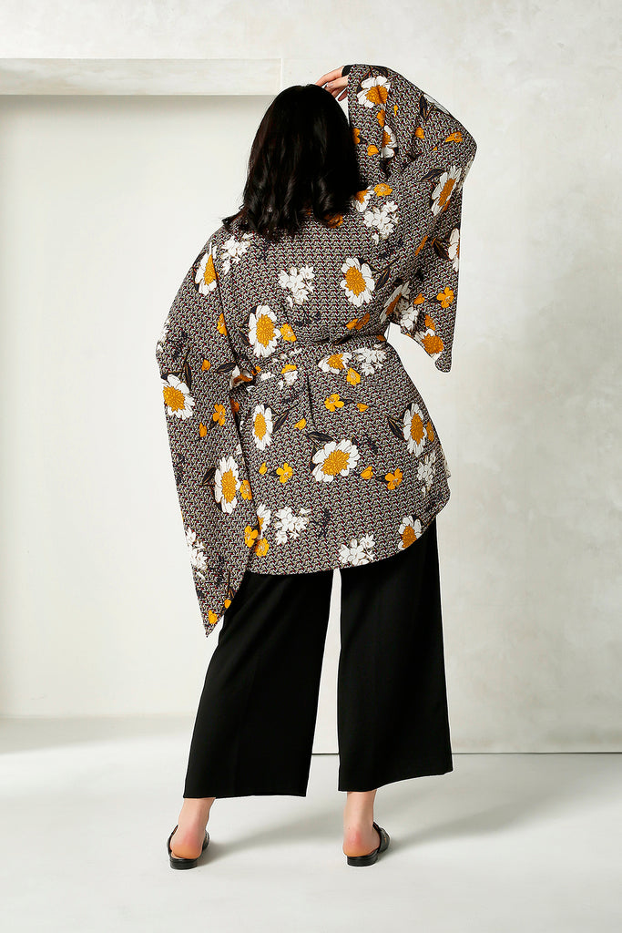 The tropical print of the Tropicana Short Kimono is a Kimaya classic. The tailored square-sleeved kimono shape in this beautiful print is easy to match with any outfit. The lightweight crepe creates a fluid and feminine silhouette when accentuated with the accompanying belt.